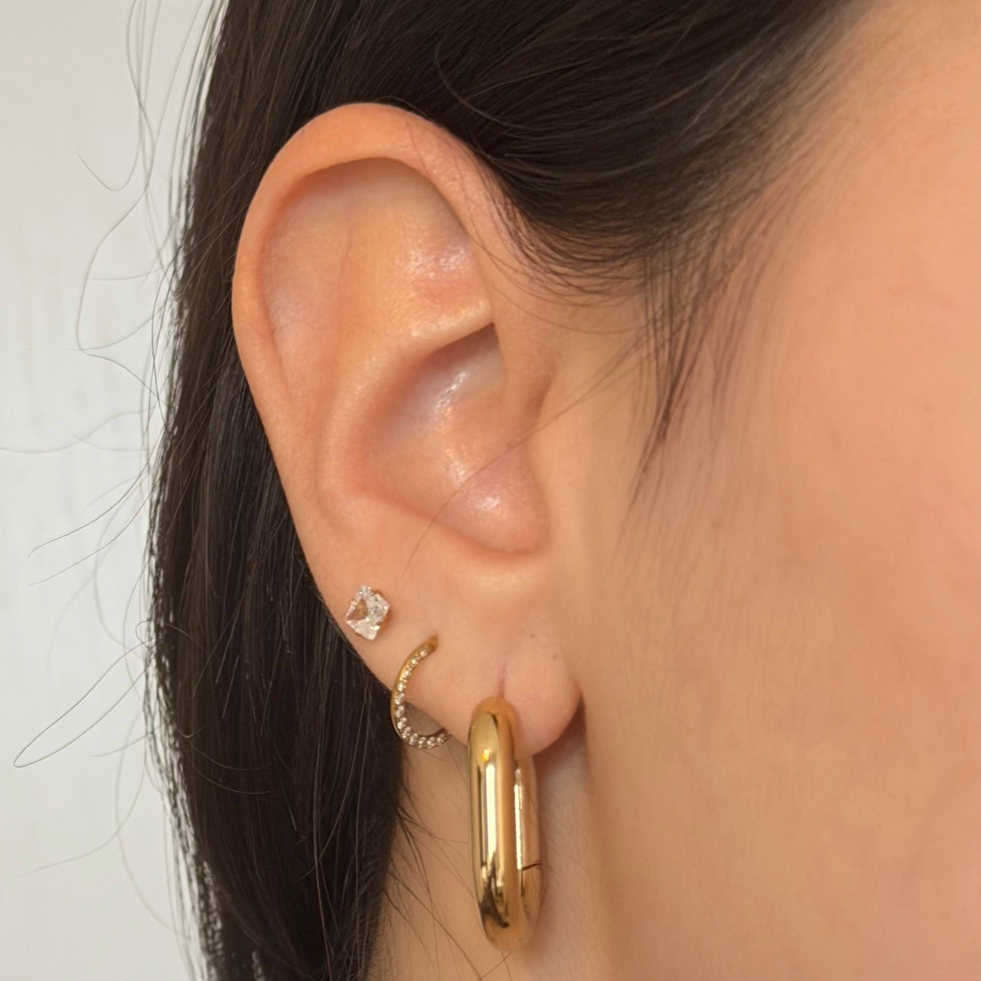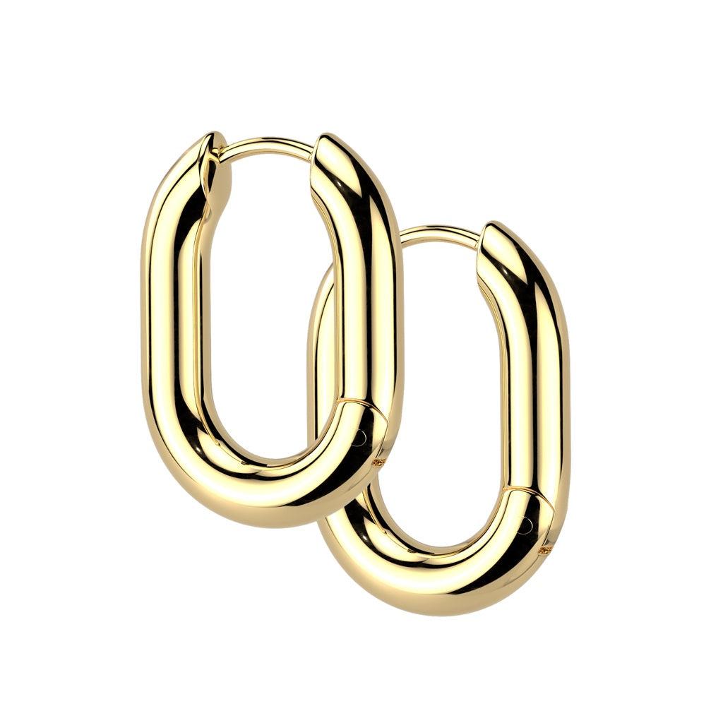 .חישוק מלבני מעוגל בגימור מבריק, הצורה הלא שגרתית שומרת על קו נקי, אבל עם נוכחות חזקה וברורה. מתאימים למי שמחפשת תוספת חדה לסטייל היומיומי.